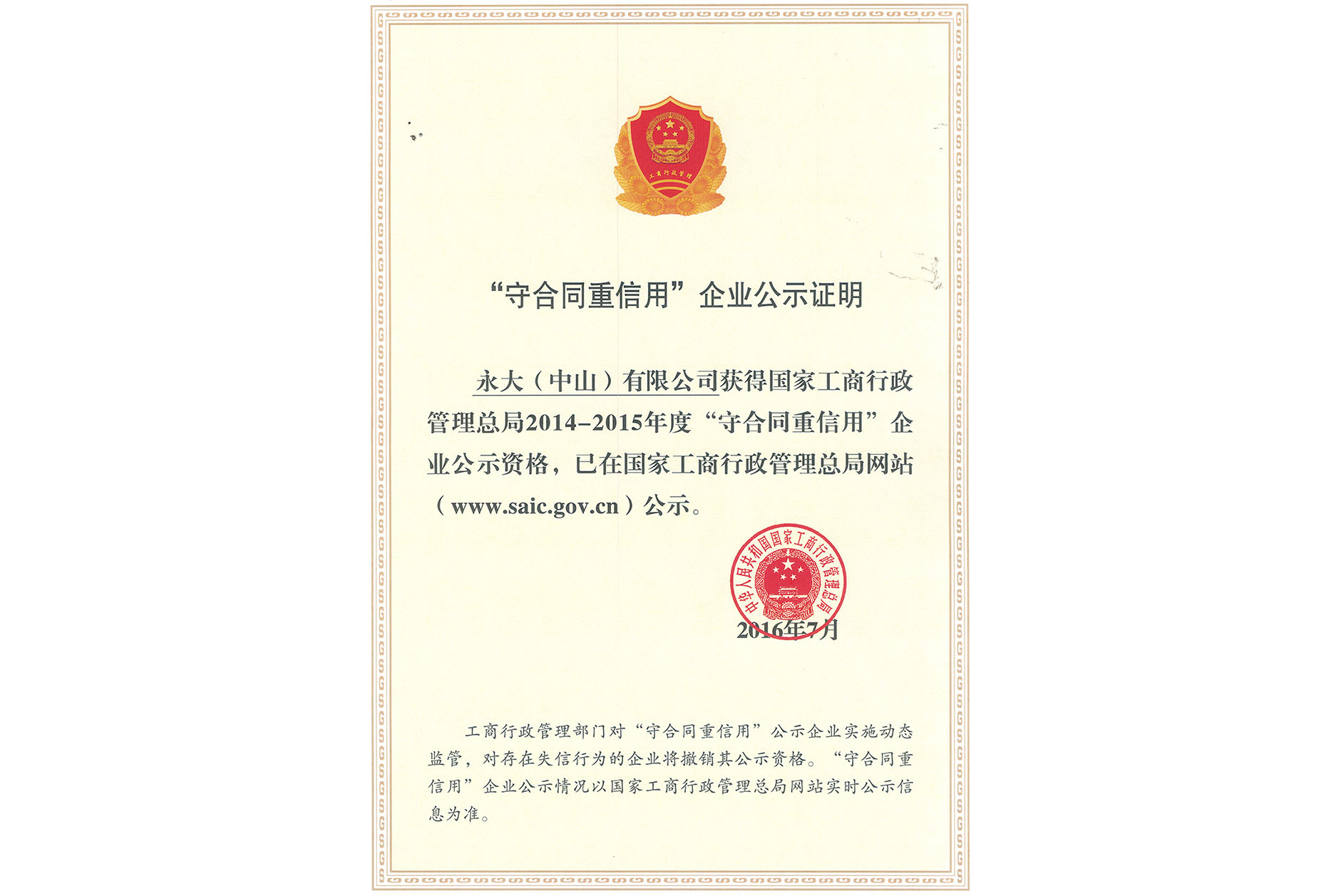 *公司连续十七年获国家市场监督管理总局颁发“全国守合同重信用”企业